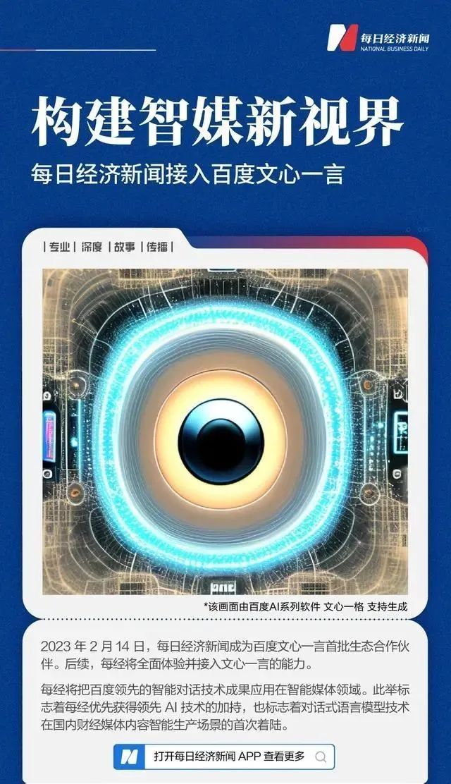 2023 年 2 月 14 日,每日经济新闻 成为百度文心一言(英文名:ERNIE Bot)首批生态合作伙伴。后续,每日经济新闻将全面体验并接入文心一言的能力。