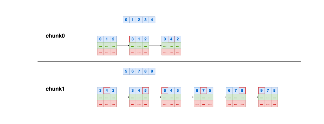 不难理解,对于每个 chunk 来说,只有倒数 $W$ 个 token 的 KV 值才应该进 KV cache。例如对 prompt 0 的 chunk-0,我们自然而然会认为用它更新 KV cache 后,KV cache 中 token 的排布应该是 [2, 3, 4],但真的是这样吗?