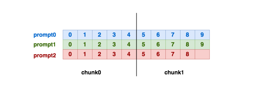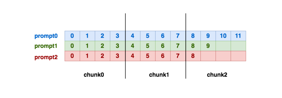 最后我们来看 chunk-2,这个 chunk 比较特殊,因为在这个 chunk 内,每一个 prompt 维护的序列长度是不一样的,3 个 prompt 维护的 tokens 分别为 [[8, 9, 10, 11], [8, 9], [8]]。
